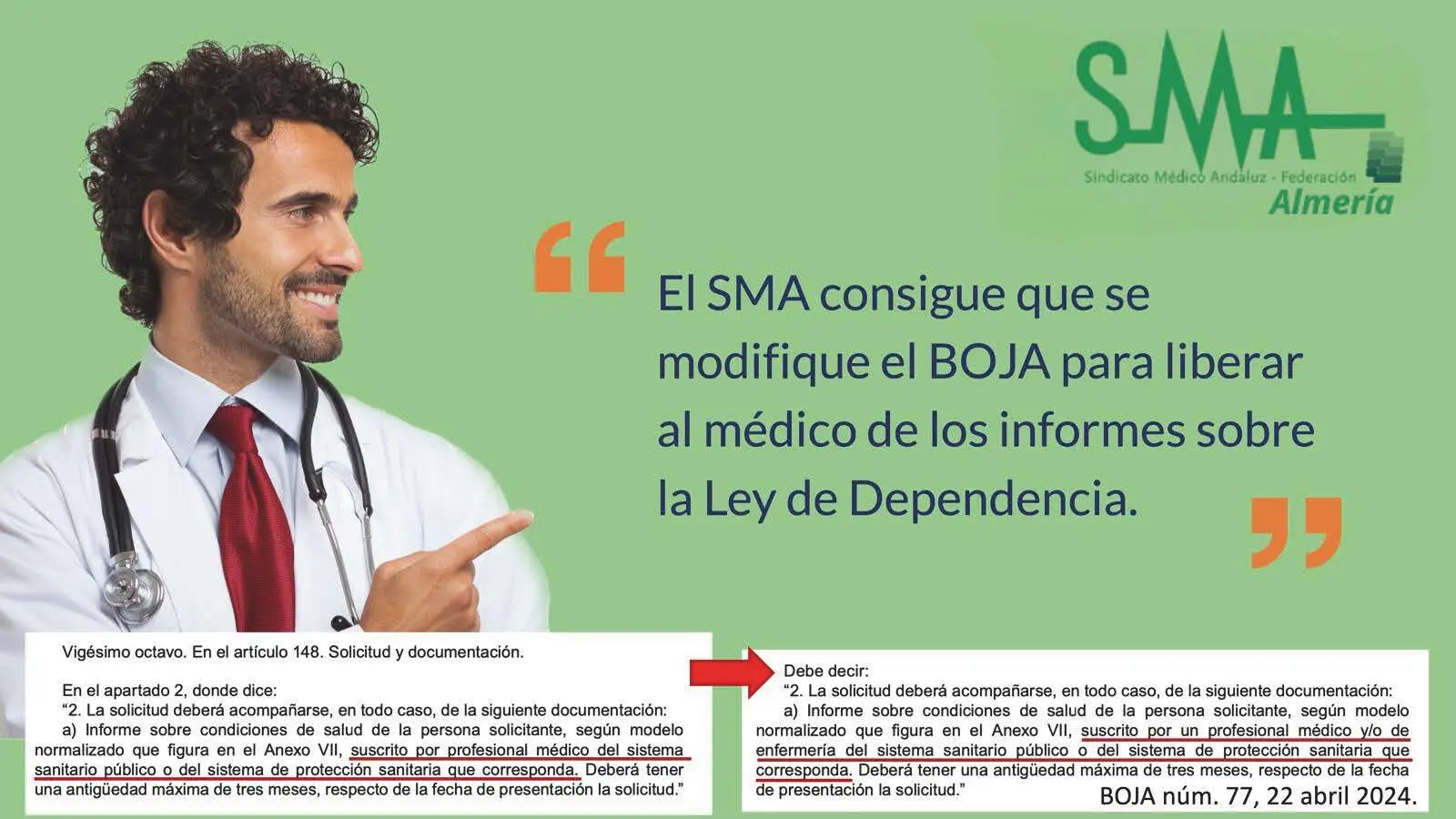 El SMA consigue que se modifique el BOJA del pasado día 22 de Abril especificando que la ley de la dependencia debe ser suscrita tanto por un medico/a como por un enfermero/a. Tras el Decreto-ley 3/2024, en el que se adoptan medidas de simplificación y racionalización administrativa, se establecen una serie de cambios en el procedimiento para solicitar la prestación por dependencia que en primera instancia eran competencia exclusiva del facultativo.