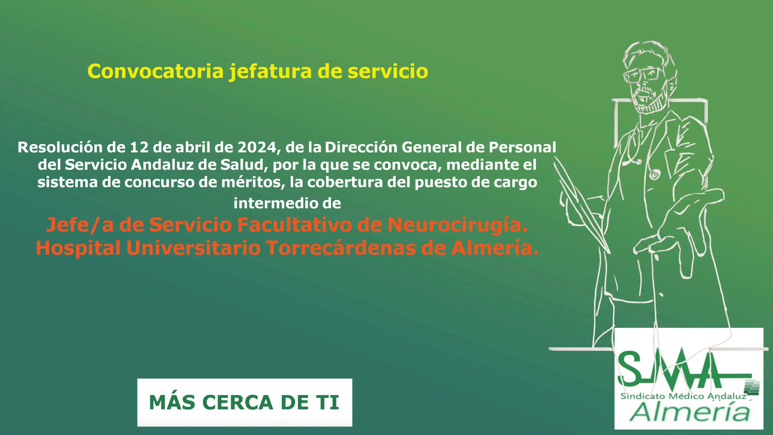 Resolución de 12 de abril de 2024: Se convoca, mediante el sistema de concurso de méritos, la cobertura del puesto de cargo intermedio de Jefe/a de Servicio Facultativo de Neurocirugía en el Hospital Universitario Torrecárdenas de Almería.