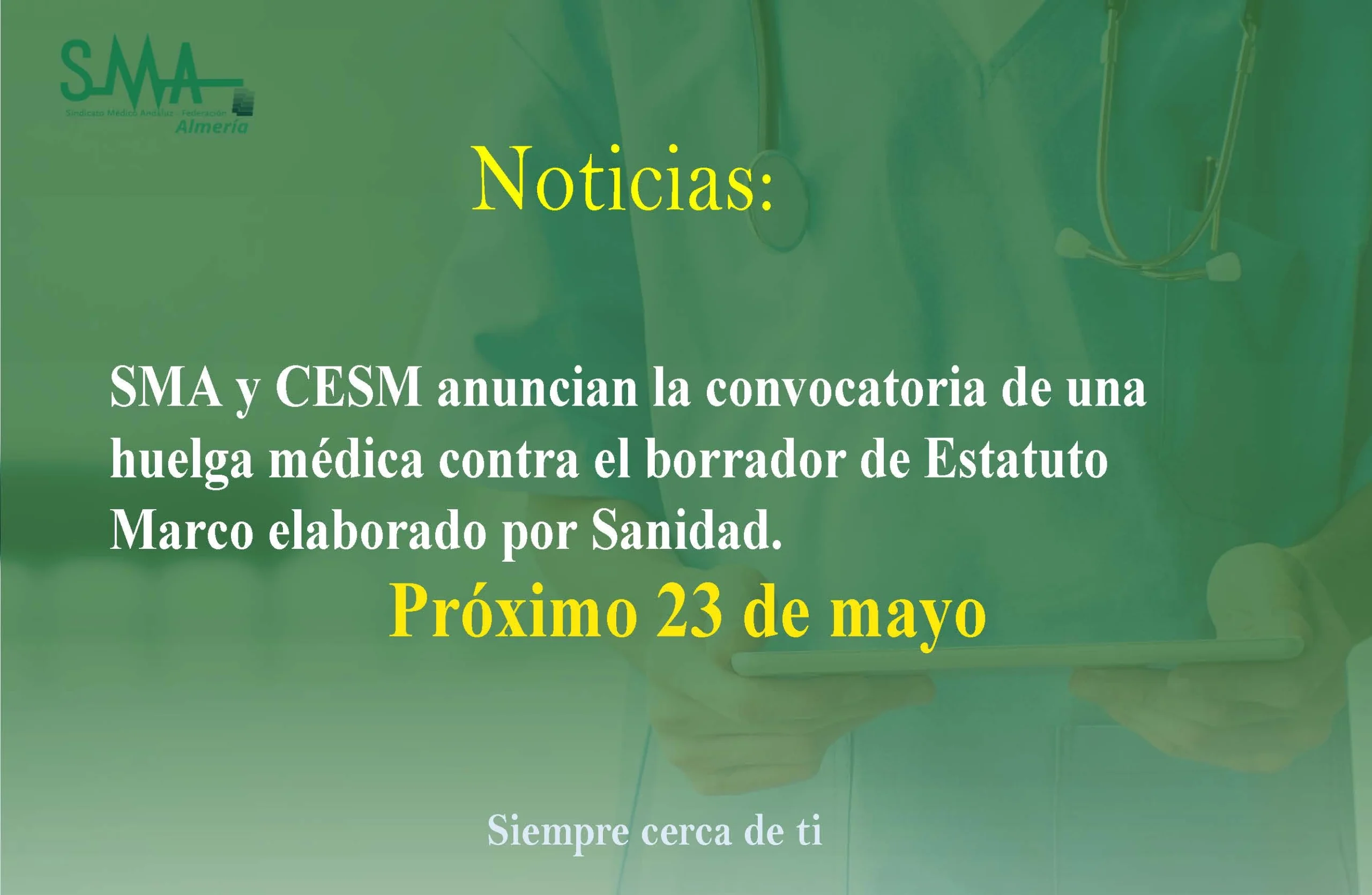 El Comité Ejecutivo de la Confederación Española de Sindicatos Médicos (CESM), con el respaldo del Sindicato Médico Andaluz (SMA) han aprobado la convocatoria de un conflicto de huelga en toda España para el próximo mes de mayo, con el objetivo de lograr una modificación legislativa que permita a los médicos negociar sus condiciones laborales, recogidas en el Estatuto Marco, en un ámbito distinto al actual, en el que tengan una representación real para decidir las condiciones, obligaciones y derechos de los médicos y facultativos.